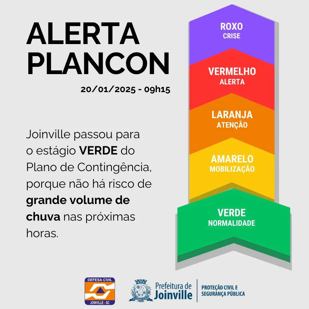 A Defesa Civil de Joinville anunciou nesta segunda-feira (20) o retorno do Plano de Contingência ao estágio Verde, indicando normalidade no cenário de risco. A decisão foi baseada nos dados do Centro Nacional de Monitoramento e Alertas de Desastres Naturais (Cemaden), que apontam a ausência de chuvas significativas nas últimas horas.
