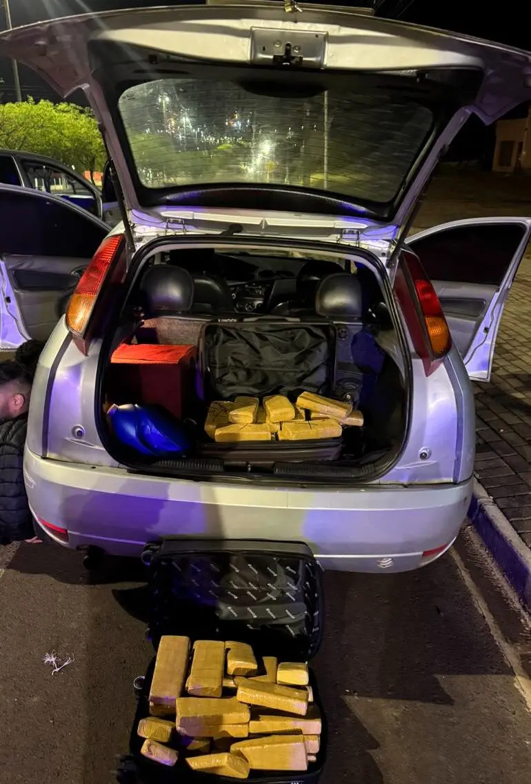 Por volta das 04h30min, o carro foi visualizado chegando à cidade de Vitorino/PR, onde foi imediatamente abordado. Constatou-se que o automóvel era conduzido por um homem venezuelano, de 26 anos de idade, e transportava um passageiro brasileiro, de 18 anos de idade. Durante as buscas, foram encontradas duas malas contendo 65 tabletes de substância análoga à maconha, pesando aproximadamente 35 quilos da droga.