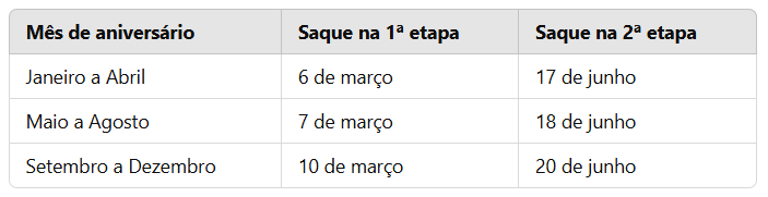 - Para quem tem conta cadastrada no aplicativo FGTS: Primeira etapa (6 de março): Crédito automático de até R$ 3 mil na conta indicada. Segunda etapa (17 de junho): Valores acima de R$ 3 mil serão creditados automaticamente.